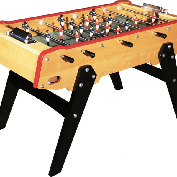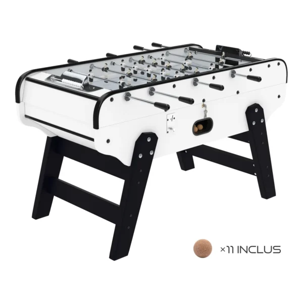 Montage : Le corps du baby-foot est livré assemblé d’un seul bloc (conception monobloc) pour une rigidité maximale. Seuls les pieds en métal sont à fixer à la caisse.