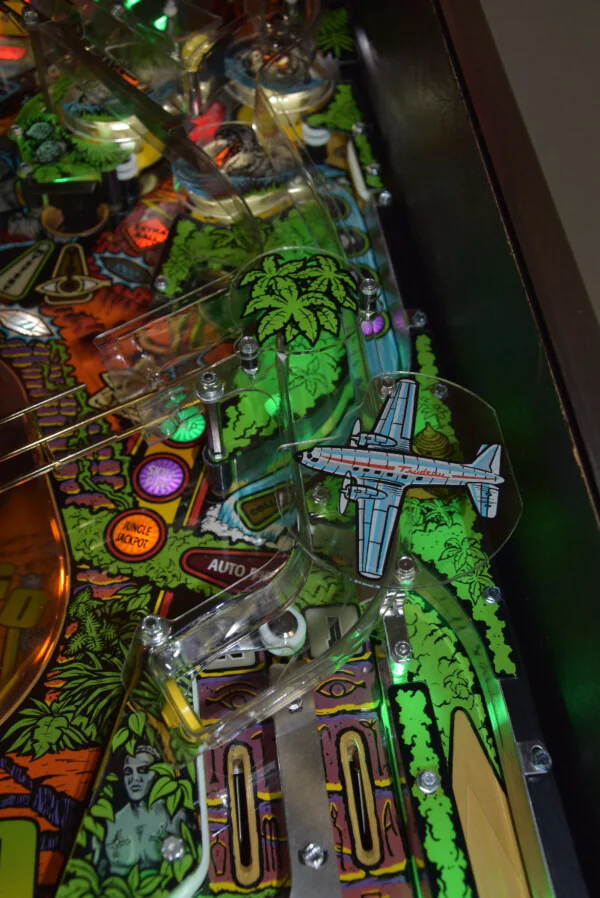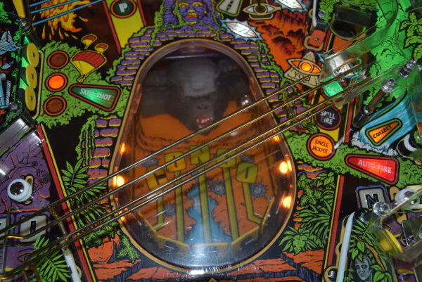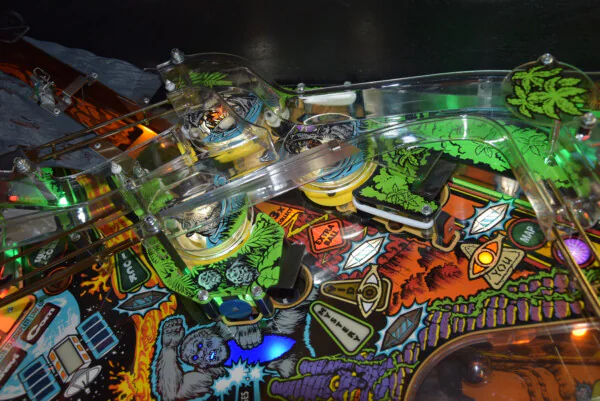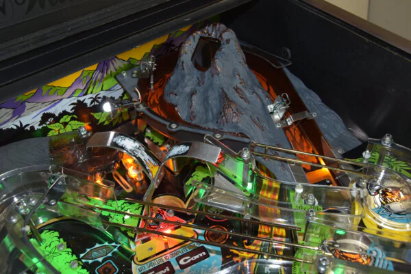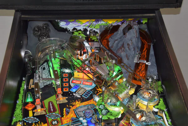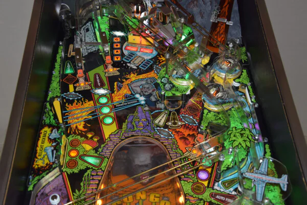 Ce modèle est un véritable appareil de collection. Il a bénéficié d'une attention particulière avec l'installation de LEDs et d'un protecteur de plateau, garantissant une esthétique éclatante et une protection durable de la surface de jeu. Le layout du plateau retranscrit fidèlement l'ambiance sauvage du film, avec ses gorilles agressifs, ses serpents venimeux et son volcan menaçant prêt à entrer en éruption.