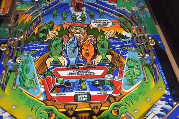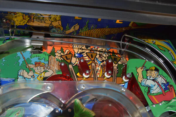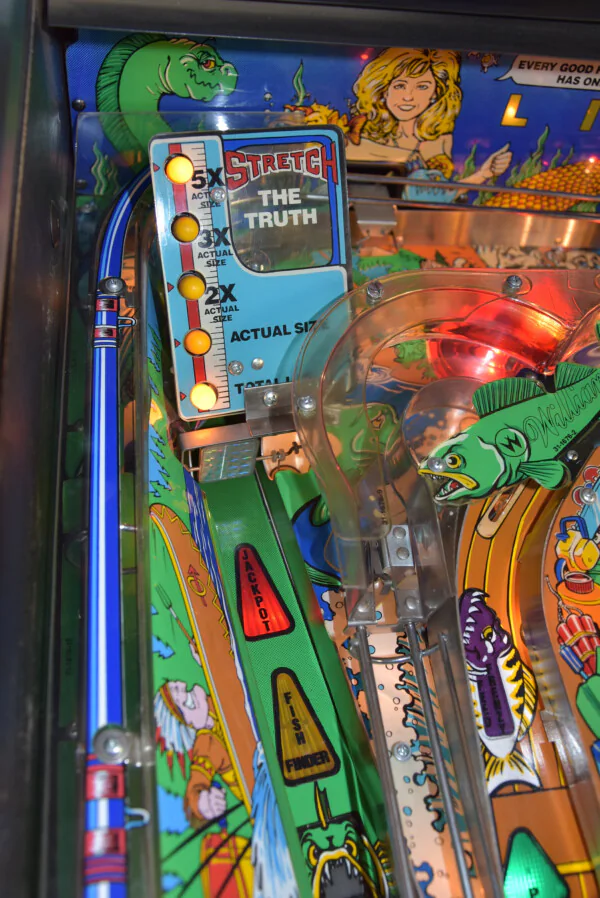 Ce flipper regorge de détails amusants et de mécanismes ingénieux. Le point fort visuel est sans conteste le poisson articulé (perche) monté sur le fronton, qui s'agite frénétiquement dès que vous réalisez un exploit. Sur le plateau, vous trouverez une moulinet électrique pour capturer les billes, une rampe centrale en forme de bateau et un "Liarometer" (baromètre des menteurs) qui classe vos performances de pêcheur.
