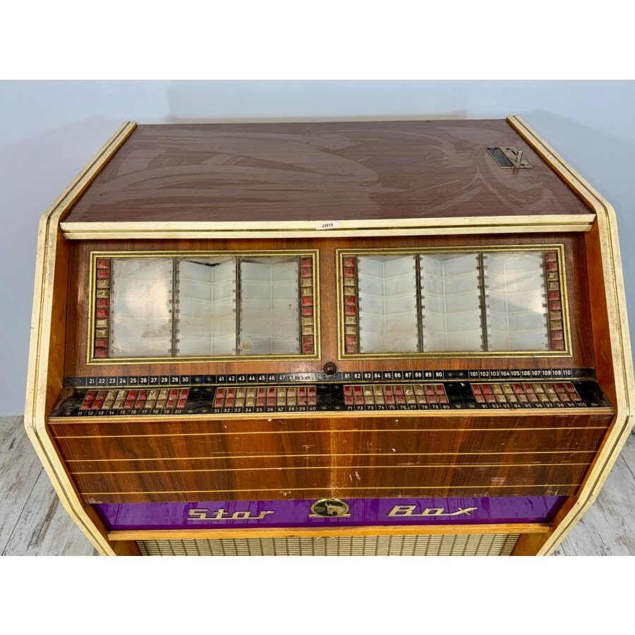 Jukebox AMI Böck Star Box (Conversion AMI E120) Occasion 1966. Non restauré, non jouable (haut-parleur manquant, ampli non testé). Idéal projet restauration. Pièce vintage rare 220V.