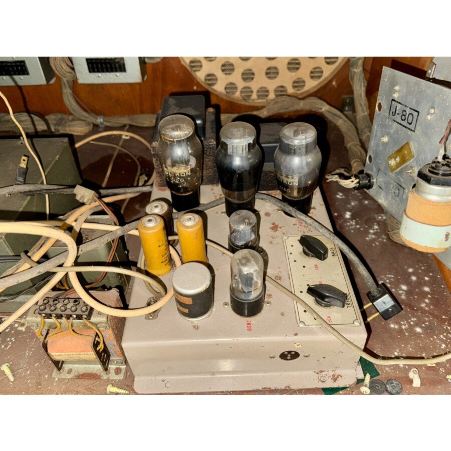Cet appareil est un projet. Des travaux techniques (révision mécanisme, vérification/réparation ampli, ajout haut-parleur) et esthétiques (nettoyage, retouches meuble) sont nécessaires pour le rendre jouable.