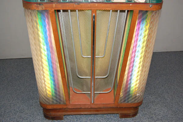 Sa signature esthétique repose sur son magnifique Vista Plexidome en trois parties, qui abrite un diffuseur de lumière "arc-en-ciel" créant une ambiance visuelle spectaculaire. Les porte-titres et les boutons de sélection rétroéclairés complètent ce design audacieux, typique de l'ère optimiste de l'après-guerre.