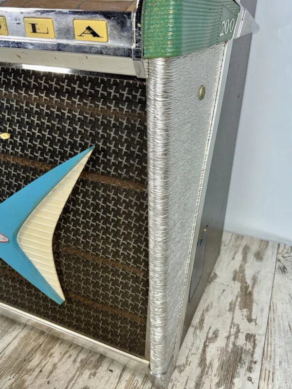 Saisissez l'opportunité de restaurer une icône de l'âge d'or américain : la Rock-Ola 1485 Tempo 2. Produit en 1960, ce modèle est l'un des plus recherchés par les collectionneurs pour son design flamboyant et sa capacité impressionnante de 200 sélections sur disques 45 tours.