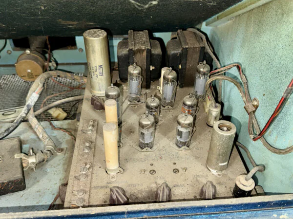 • État Esthétique : Meuble d'origine avec traces d'usure liées à l'âge. Dôme en bon état. "Ciel" intérieur intact. Pilastres en très bon état. Présence de rouille superficielle sur la grille du haut-parleur.