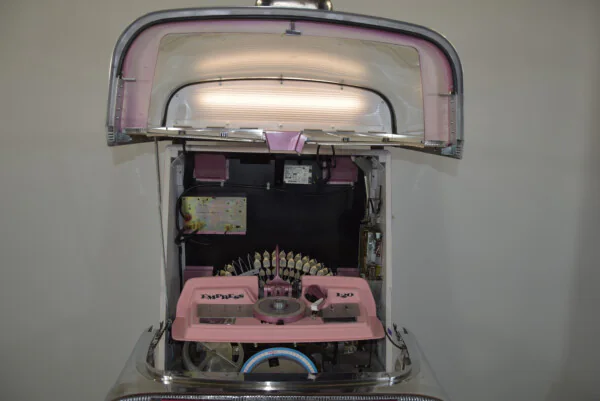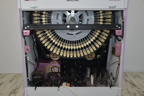 L’élégance impériale des années 60 : la Rock-Ola 1496 Empress. Ce modèle 120 sélections a bénéficié d’une magnifique restauration de son boîtier. Équipé d’un amplificateur fonctionnel, de haut-parleurs neufs et d’une alimentation en 220V, ce Jukebox stéréo est prêt à faire vibrer vos vinyles 45 tours. Un investissement passion pour les amateurs de design rétro.