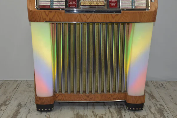 Le mythique Seeburg Modèle C de 1953, véritable icône de la culture Rock’n’Roll. Cet exemplaire se distingue par une restauration esthétique soignée : chromes neufs, pilastres neufs et boîtier replaqué. Doté d’un amplificateur fonctionnel et d’une mécanique complète, c’est l’un des modèles les plus désirables pour tout amateur de vinyles 45 tours. Import US 110V.