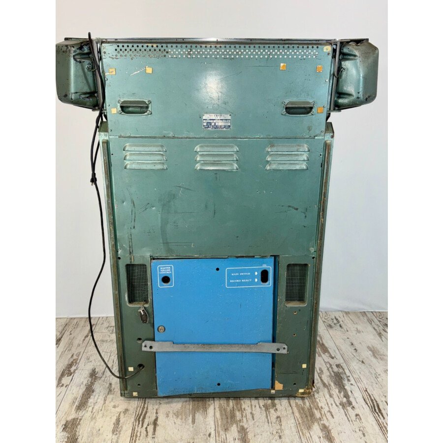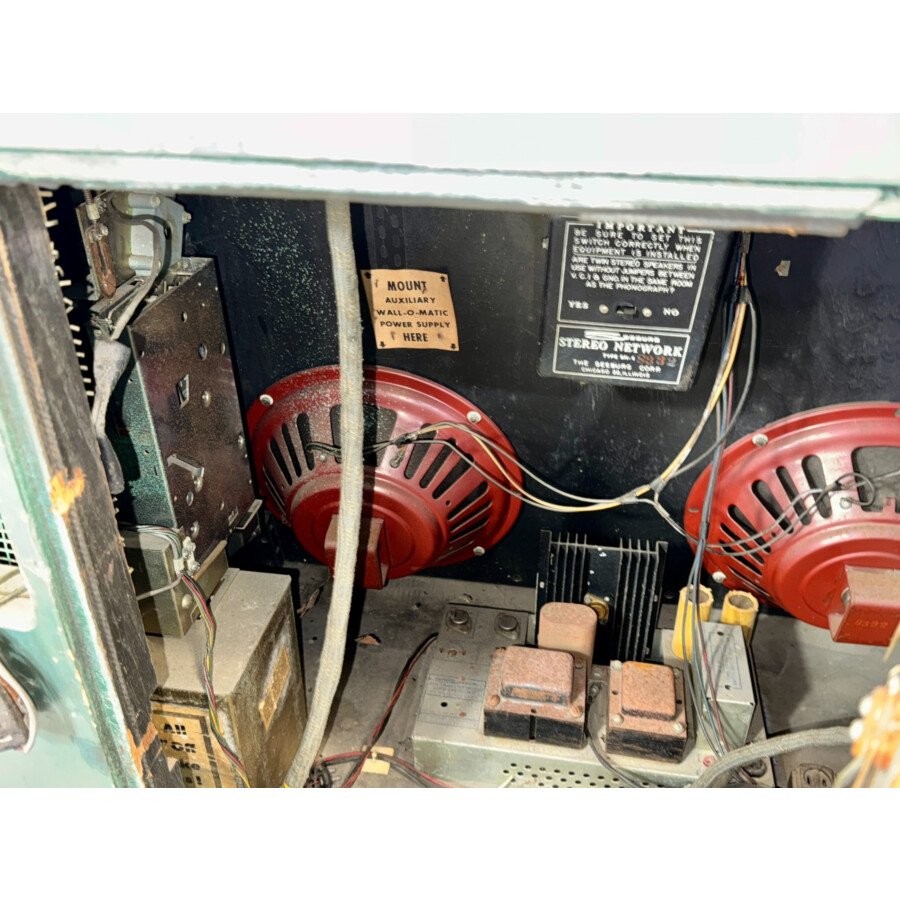 Cet appareil est vendu non restauré, non jouable en l’état et non testé dans son ensemble. Il présente de nombreuses traces de son utilisation passée et nécessite une attention technique et esthétique significative pour retrouver sa splendeur et sa fonctionnalité. La technique est complète autant que l’on puisse en juger, mais non testée. L’amplificateur est également non testé. Le boîtier est dans son état d’origine avec des traces d’utilisation, et des défauts spécifiques (rouille sur la grille, chrome piqué…). La partie de contrôle n’est pas originale, car un stockage de crédit différent a été installé. L’appareil est un import US en 110V 60Hz. C’est une base intéressante pour un collectionneur averti ou un restaurateur de se procurer ce modèle vintage Seeburg.