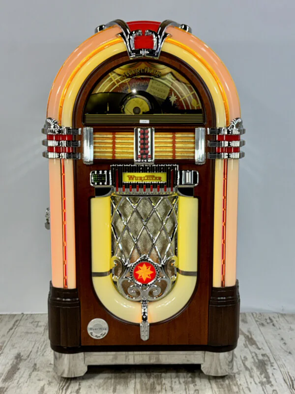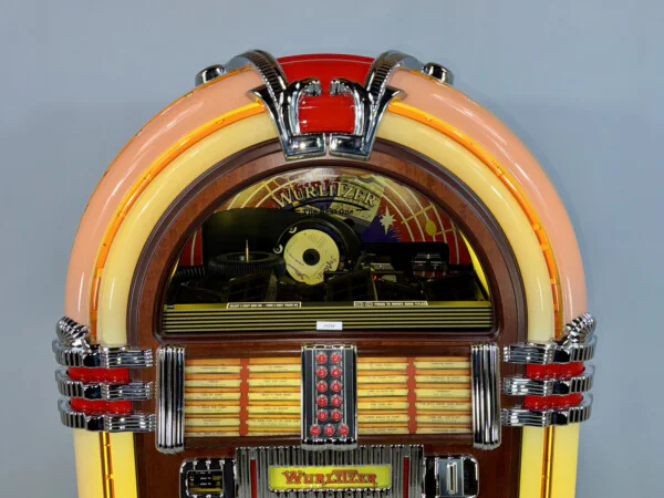 L’icône Wurlitzer 1015 OMT en version CD. Ce modèle de 2001 offre une capacité de 100 CD et le design nostalgique légendaire avec ses célèbres Bubble Tubes. Entièrement révisé techniquement et prêt à l’emploi, il combine un son laser d’une clarté cristalline de 110W RMS avec une esthétique irréprochable. Une pièce de collection indispensable.
