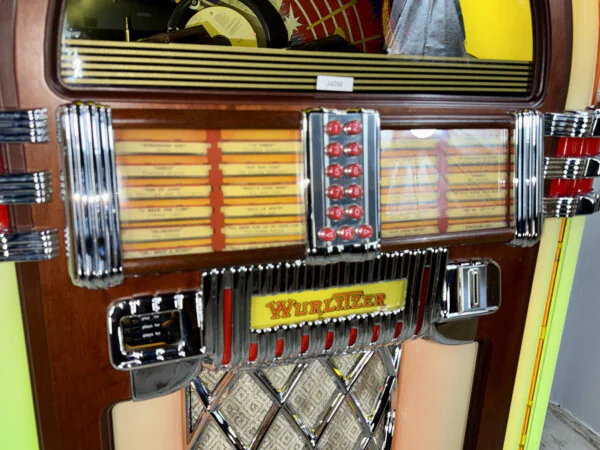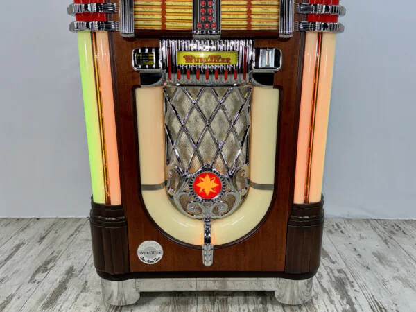 L’icône Wurlitzer 1015 OMT en version CD. Ce modèle de 2001 offre une capacité de 100 CD et le design nostalgique légendaire avec ses célèbres Bubble Tubes. Entièrement révisé techniquement et prêt à l’emploi, il combine un son laser d’une clarté cristalline de 110W RMS avec une esthétique irréprochable. Une pièce de collection indispensable pour tout amateur de musique.