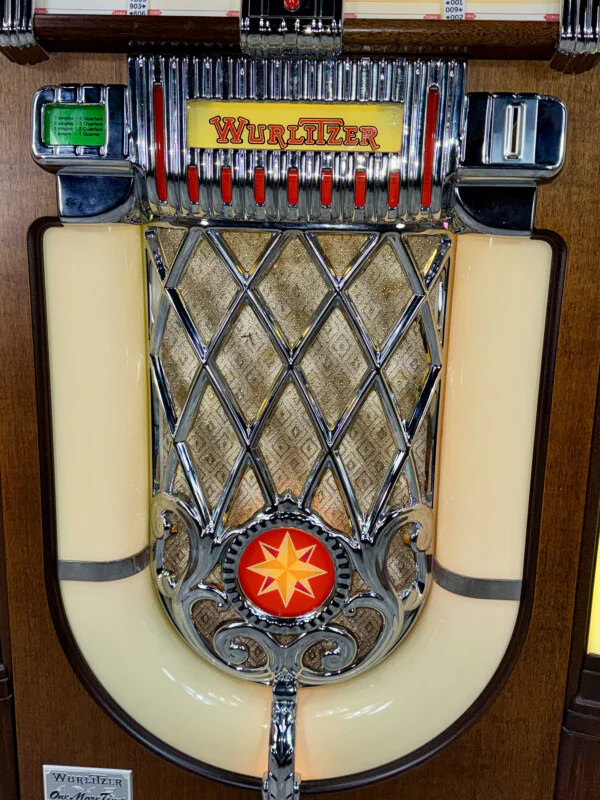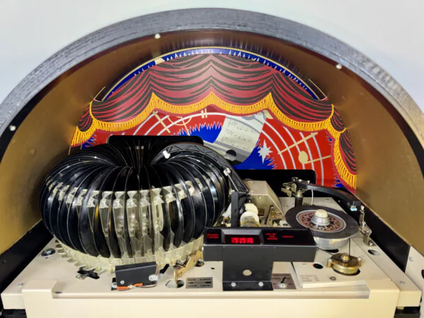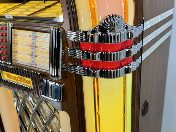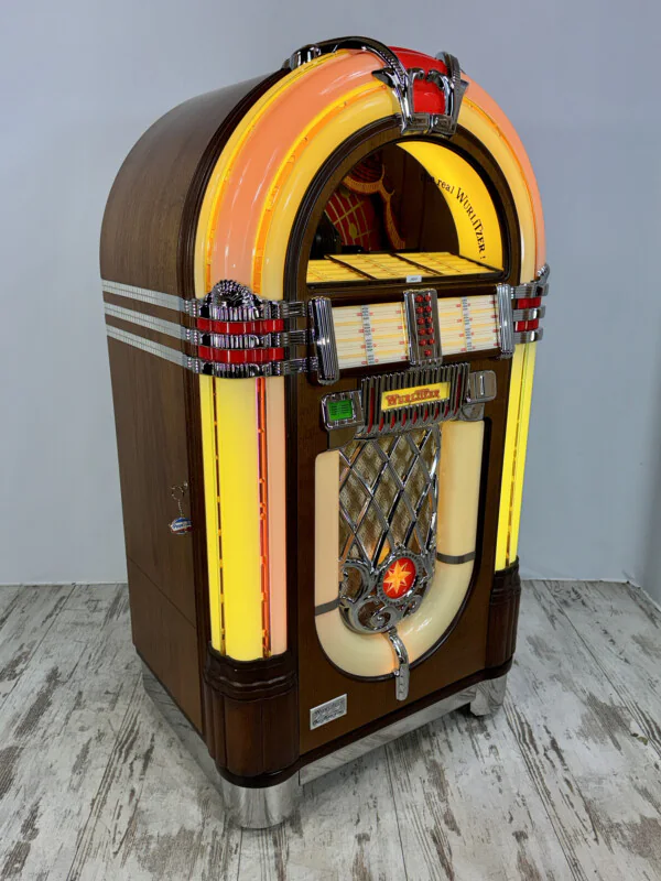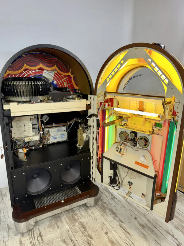 Retrouvez toute l'âme du Jukebox le plus célèbre de l'histoire avec le Wurlitzer 1015 One More Time (OMT) Vinyle. Ce modèle combine le design nostalgique inoubliable des années 40 avec la fiabilité technologique des années 80. Fabriqué en 1989, cet appareil d'occasion a été entièrement révisé techniquement et est prêt à l'emploi.