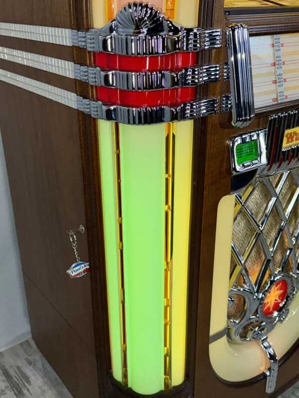 Les célèbres Bubble Tubes (tubes à bulles) et les cylindres colorés rotatifs fonctionnent parfaitement, créant cette ambiance lumineuse unique qui a fait la réputation de Wurlitzer. Équipé d'un système de lecture Shure haute qualité, ce Jukebox offre un son chaud et puissant pour vos disques vinyles 45 tours préférés.
